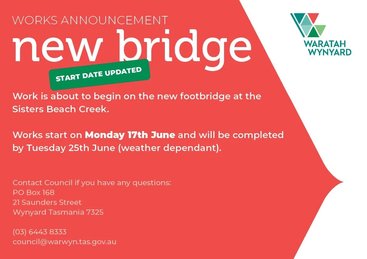 WW Council have advised the SBCA that works on the new footbridge will start on Monday 17th June and will be completed by Tuesday 25th June.